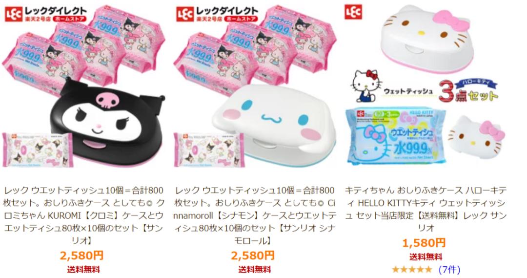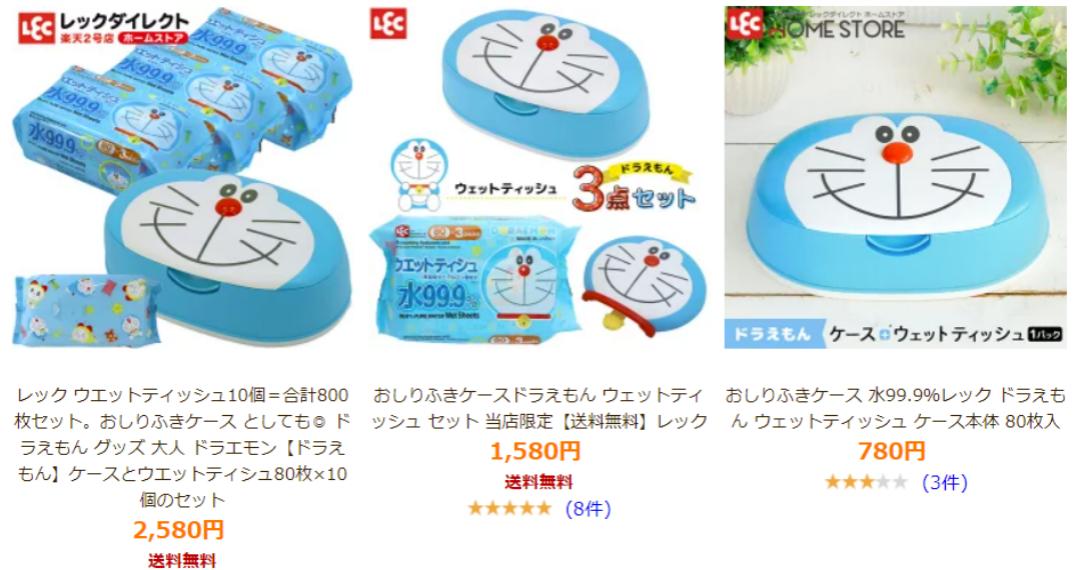 迪士尼授权了多个知名IP,米老鼠、美女与野兽、小美人鱼、阿拉丁、三眼仔等经典形象,LEC将这些形象用于湿巾类产品外包装。乐天市场上,使用迪士尼形象的湿巾单盒售价为2280日元,约合人民币134元。