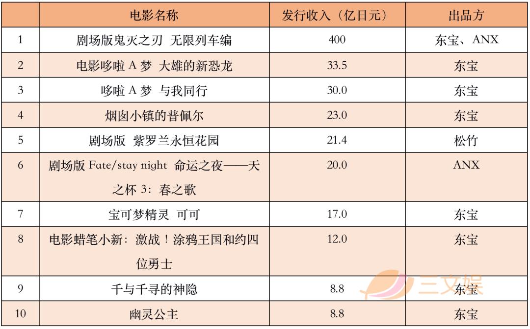 而日本动画近年吹起怀旧风、情怀风,也体现了经典IP的持久吸金能力。2020年动画电影发行收入前10名中除了黑马《鬼灭之刃》和《烟囱小镇的普佩尔》,其他都是经典动漫IP电影。