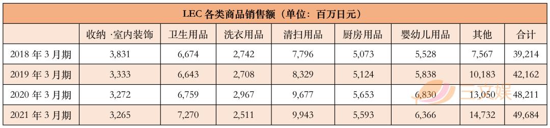 可以看出,LEC目前的各类商品中,除去无法分类的其他类之外,卫生用品、清扫用品、厨房用品、婴幼儿用品一直是赚钱的大头。2021财年LEC的总销售额为496.84亿日元,其中这四项总和为291.72亿日元,占总收入的58.72%。
