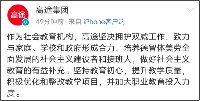7月24日晚23时59分,高途集团通过官方微博转发人民日报对于该《意见》的报道,高途对此表示坚决拥护党中央、国务院的战略部署,深入贯彻党的十九大和十九届五中全会精神,深刻领会“双减”工作的重大意义,坚守教育初心,坚守教育本质,坚守合规经营,勇于承担社会责任,服务国家发展大局,秉承“科技让教育更美好”的使命, 持续为培养德智体美劳全面发展的社会主义建设者和接班人全力以赴。