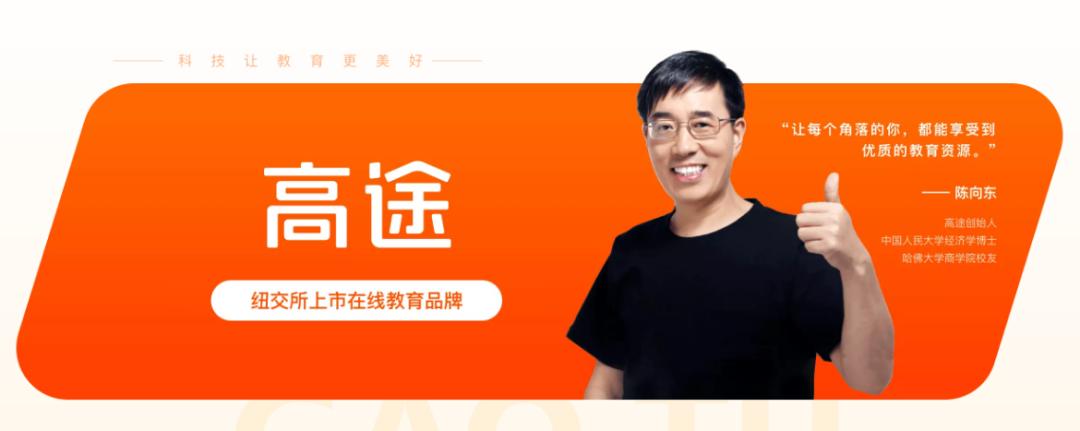 据官网介绍,高途是一家兼具教育基因和科技驱动力的科技教育公司。其前身“跟谁学”于2014年6月由陈向东带领创建,团队成员主要由来自新东方等著名教育培训机构及百度、阿里等互联网公司的核心技术骨干组成。目前,高途产品覆盖了考研、语言培训、职业资格培训,以及中小学全科等。