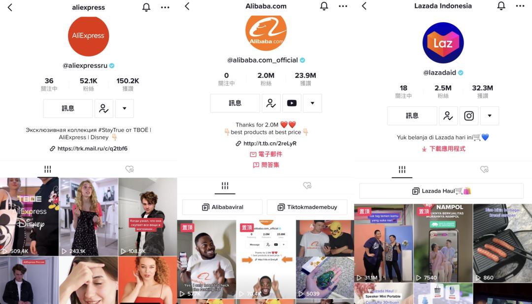 燃财经发现,阿里旗下三大跨境电商平台阿里巴巴国际站、全球速卖通(AliExpress)、Lazada都在TikTok注册了账号,阿里巴巴国际站企业号有200万粉丝,Lazada印尼站、菲律宾站账号分别有250万、220万粉丝,其他账号粉丝数也在5万-150万不等,短视频播放量最高可达2500万次。Lazada印尼站直接开通了小店功能,其他账号主页则放了APP下载链接或商城网址。