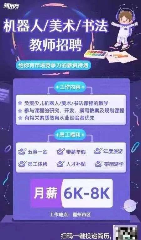 “论速度,还是我新东方大哥”,同样,又有员工贴出新东方的招聘图片,图片上写着,新东方福州市区,正在招聘机器人、美术、书法教师。