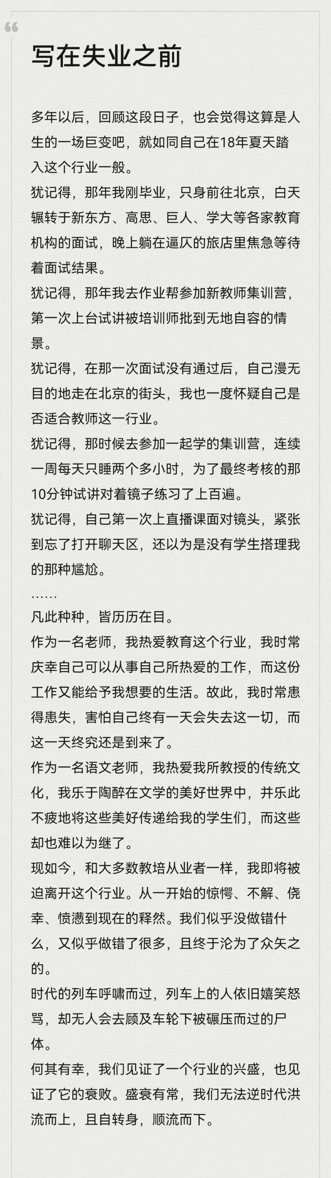 “作为一名老师,我热爱教育这个行业,我时常庆幸自己可以从事自己所热爱的行业,而这份工作又能给予我想要的生活。故此,我时常患得患失,害怕自己终有一天会失去这一切,而这一天终究还是到来了。”