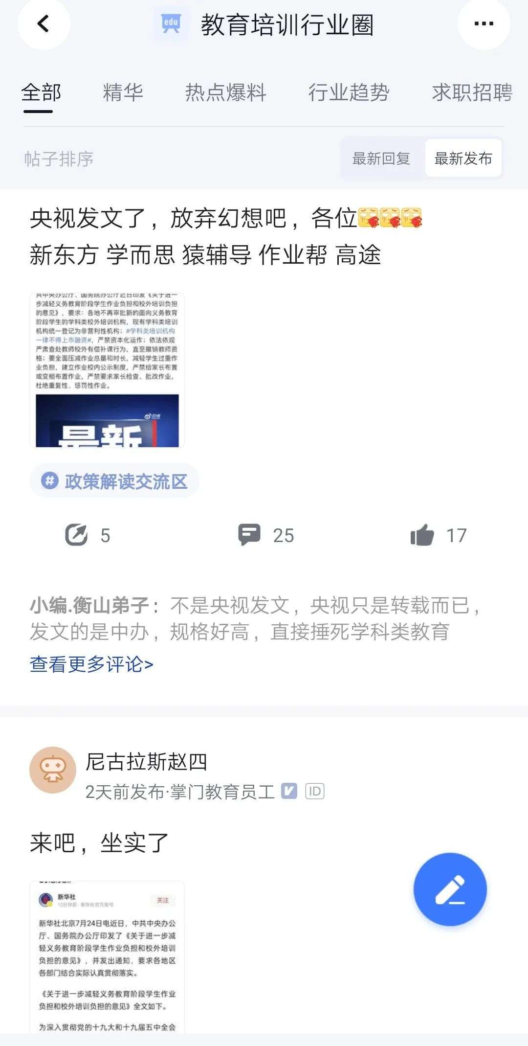 脉脉上教育培训的职场圈子里,讨论是从24日前一日开始的。23日,“双减”文件在市面上流传,随后多地教育机构有关人士相继确认收到相关文件。
