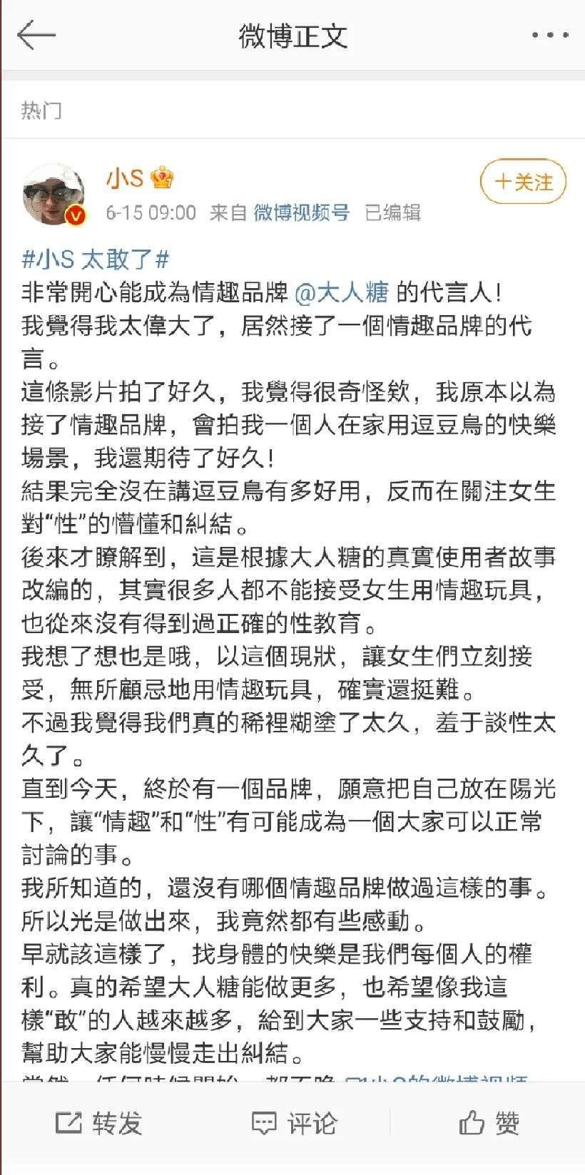 今年,更有品牌首次找了明星代言人,请来小S为情趣用品带货。作为敢爱敢恨的综艺女王,小S曾多次鼓励大众丢掉偶像包袱和害羞自卑、绽放性魅力。这也就代表,她成为“首位”试水成人品牌的女性代言人,会非常具有说服力。截至发稿前,伴随代言官宣发布的宣传视频《超感性日记》播放量已经达到2396万。