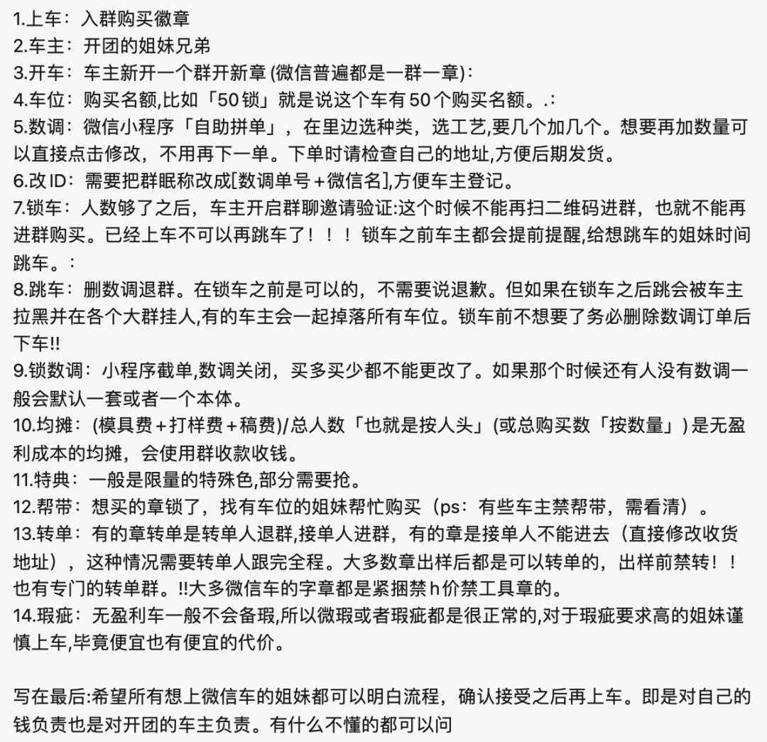 上过几百辆车的「乘客」Rannia 则知道更多的八卦轶闻。在漫长的到货期中,有很多车主消失了,山河令「车主」卷款 14W 跑路,受害者超过 3000,电竞俱乐部 AG 的章圈车主也拿着 1W+ 的预付款消失。每次车主的跑路,都至少有上百受害者。