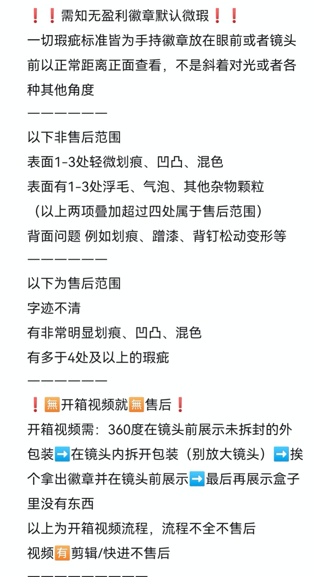 这个圈子的售后同样有着较为苛刻的规则。没有开箱视频就没有售后一说,开箱视频需要 360 度在镜头前展示未拆封的外包装,在不放大镜头的情况下拆开包装,挨个展示徽章,最后展示镜头里没有东西才可以。同时售后门槛也很高,一个章子必须有 4 处瑕疵才能保证售后,这和线上购物的七天无理由退换形成了鲜明对比。