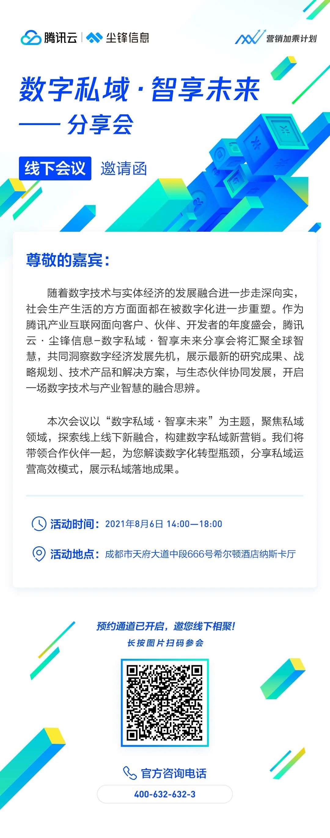 “数字私域·智享未来--线下分享会”将于8月6日在成都希尔顿酒店隆重开幕。会上,来自腾讯云的特邀专家将深入解读数字化转型趋势、问题和解决思路,并分享腾讯商业大生态的最新信号、发展布局、赋能举措等一手信息。