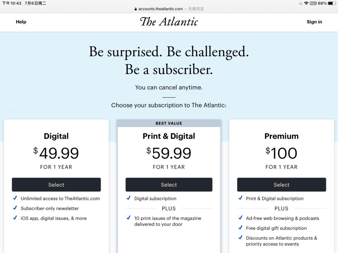 在具体的订阅模式上,《大西洋月刊》主要提供三种套餐,分别是49.99美元/年的数字版、59.99美元/年的数字版和印刷版以及100美元/年的额外付费版。