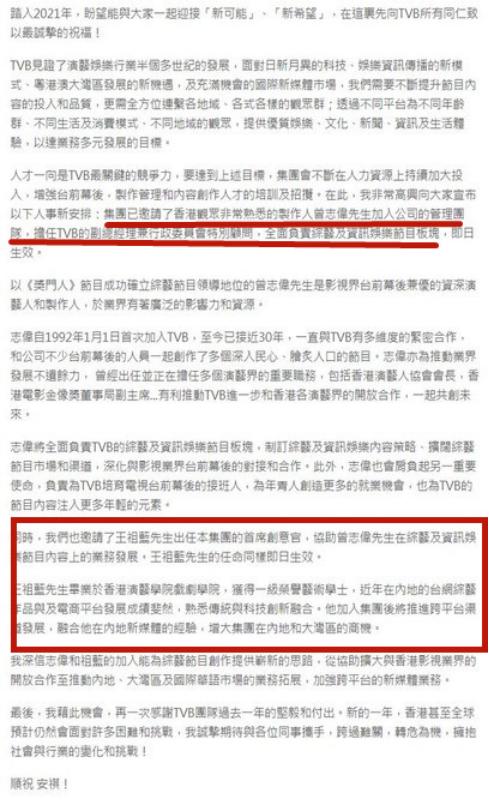 早前的内部邮件中,许涛表示,王祖蓝任职TVB后“将推进跨平台渠道发展,融合他在内地新媒体的经验,增大集团在内地和大湾区的商机。”