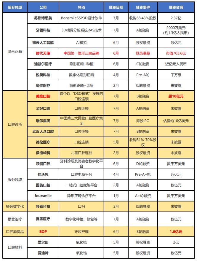 2021截止7月20日 口腔赛道投融资事件(不完全统计)