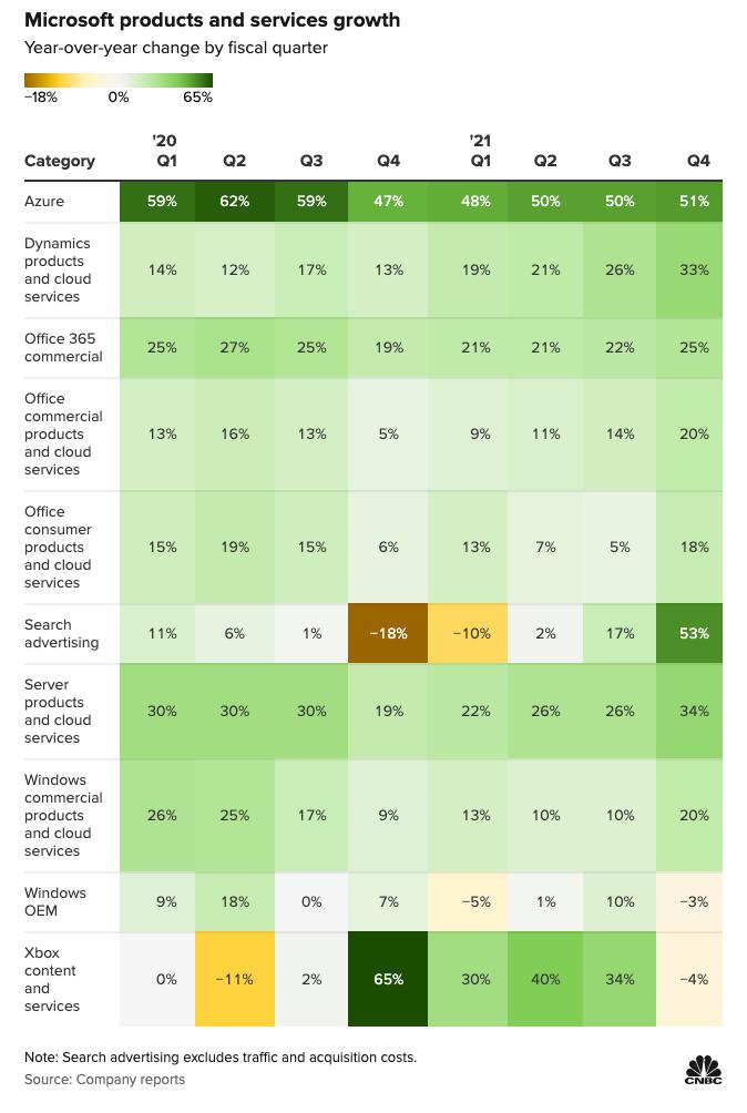 2020-2021个季度微软各细分业务增长情况,图片来源于CNBC