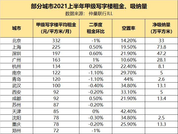 以下是仲量联行发布的“2021年第二季度主要城市甲级写字楼租金排名”