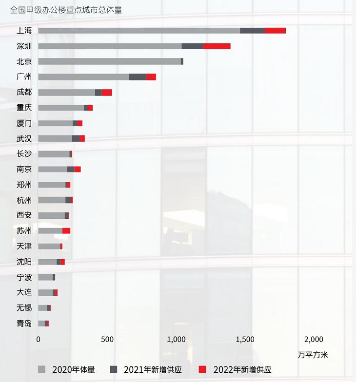需要注意的是,上图只统计了甲级写字楼存量,而非所有写字楼的存量。有数据显示,北京、上海2020年末的写字楼总存量均在9000万平方米左右,其中甲级写字楼的占比均不到15%。