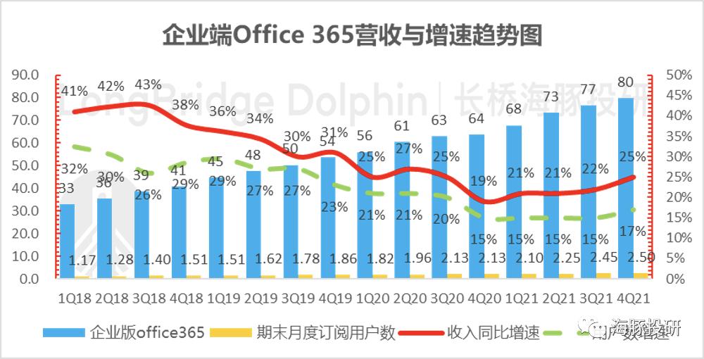 同时,企业版Office 365的客单价同比提升8%,达到了32.2美元,产品结构持续改善中。