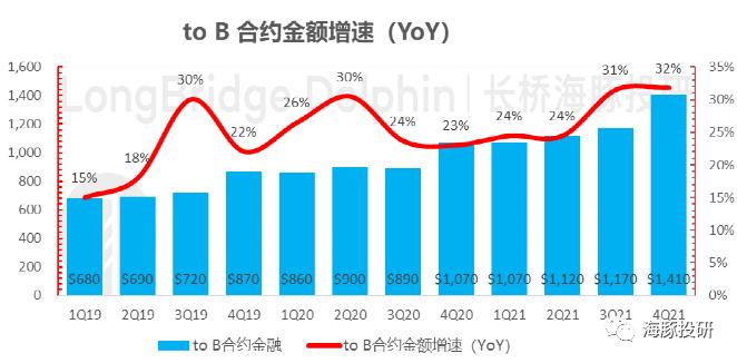本季度未,面向企业端的合同金额余额(也即基于收付实现的递延收入与未来要出票的合同金额)为1410亿(其中50%的合同余额会在一年之内确认为实际收入),同比增长32%,较上季度的31%小幅上升,增长持续在高位。