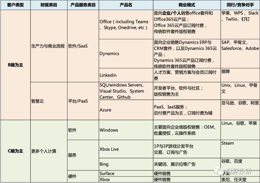 由于微软旗下资产众多,海豚君先梳理了微软主要的营收版块与下属具体的业务与产品单元、收入产生方式以及同行竞争与对标。