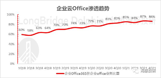 这样,整个2021财年企业Office 365渗透率提高了6个百分点,相比之前三年渗透率增加趋势是2020年8个百分点,2019年10个百分点,2018年13个百分点。