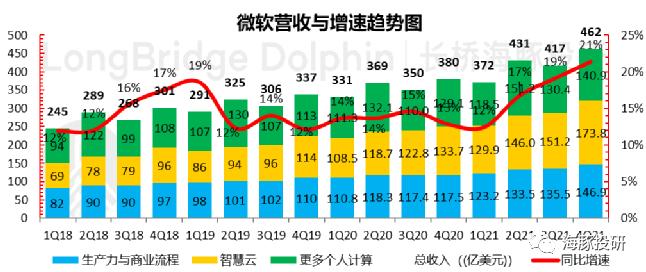 1)本季度微软整体收入超预期: 录得462亿美元,明显超出市场预期均值443亿美元,小幅超上季度给出的指引436-445亿;同比增速达到了21%。