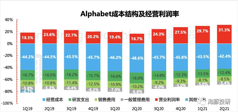 本季度实现经营利润194亿美元,同比再一次加速达203%。去年同期二季度因疫情影响,基数较低是一方面原因,从履创新高的绝对值和经营利润率上,能看到谷歌作为全球TOP科技公司,尽管整体盘子大,但依然能在一定程度上穿越经济周期的影响实现高质量的成长。
