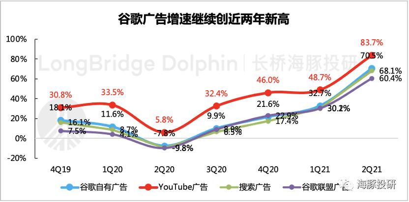 二季度谷歌实现广告收入504亿美元,同比增长68.9%,超出市场一致预期的50%。由于低基数下,欧美数字广告行业整体复苏强劲,价、量均继续提升。尤其是价格方面,此前不少专家认为,行业平均价格上涨幅度达到36%。