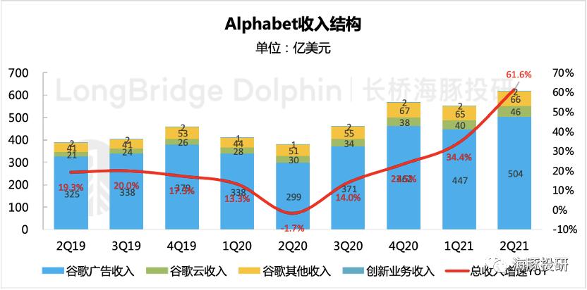 二季度公司实现总营收619亿,同比大增62%,远超市场预期的46%。一方面,占比最高的广告业务继续超预期复苏,增速刷近几年新高。另一方面,谷歌云业务的增长态势也处于健康成长的上升通道中。