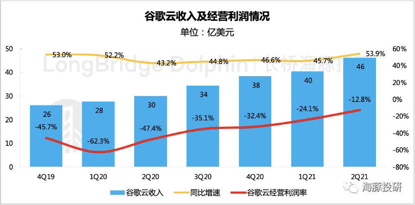 (2)云业务:二季度谷歌云同比增长54%,相比上季度再次提速,实现收入46亿,超市场预期,经营亏损也实现大幅收窄。