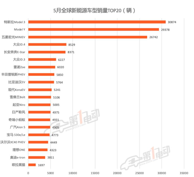 在5月份全球新能源汽车销量TOP20榜单中,位于榜首的特斯拉Model3在5月份的销量高达30874辆,而排在第二位的Model Y在5月份的销量也达到了29378辆,而这6万辆纯电动汽车需要用到大量的动力电池。