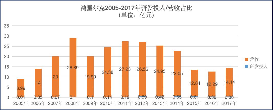 2005-2011年,他们的研发投入在营收中的占比每年不超1%。2012年占比一下子提升到2%;从此至2017年,每年的研发/营收占比保持在1.7%-4.8%之间。