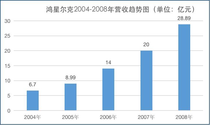 2004-2008的5年里,鸿星尔克的营收规模迅速增长,从6.7亿元飙升至28.89亿元,年增幅保持在30%-56%。