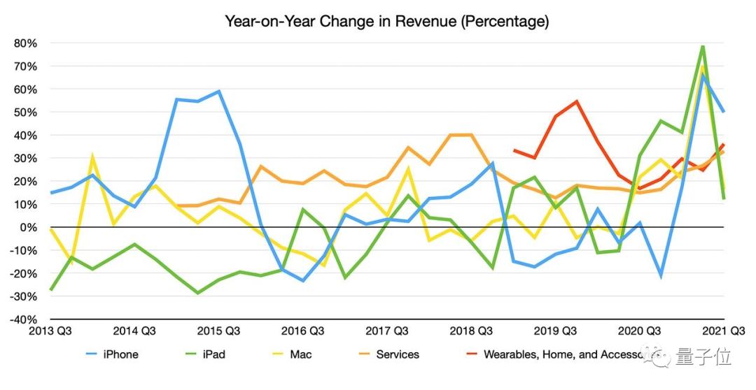△ 苹果各产品线同比增幅(图片来自Apple Insider)