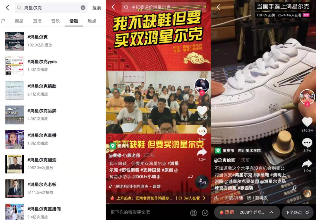 一个典型案例是,在蜜雪冰城热点中,“到门店唱主题曲”就是由抖音用户自发产出的周边话题。而在这次的鸿星尔克案例中,类似情况也没有缺席,#鸿星尔克直播间 #当画师遇上鸿星尔克#鸿星尔克yyds等热门话题也来自于普通用户的推动,相关话题的热度目前已经破亿。