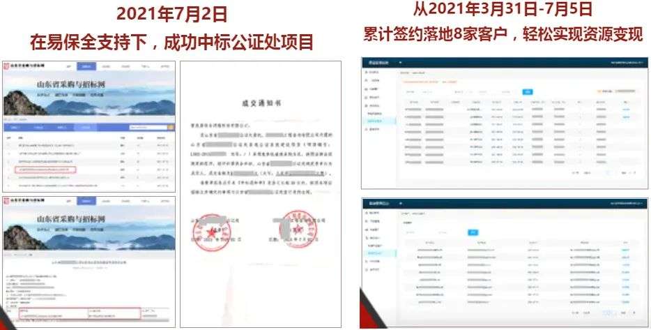 目前,易保全已助力众多企业家实现业务落地。以山东某企业家为例,在全款锁定易保全项目的第7天,就成功实现了首单业务落地回款,仅用了3个多月的时间,就落地了8家客户、中标了1个公证处项目。