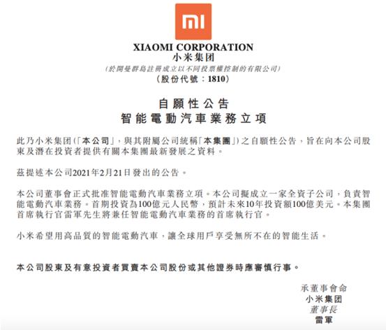 自打雷军开始造车,就一直备受行业关注。外界关注的点普遍在两个方面。在3月30日小米集团发布的公告里,一是在资金方面,小米计划首期投入100亿人民币,未来十年投资100亿美元,金额着实不小;二是,雷军将兼任该业务的首席执行官。