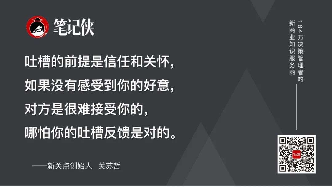 吐槽的前提是信任和关怀,如果没有感受到你的好意,对方是很难接受你的,哪怕你的吐槽反馈是对的。欲速则不达。