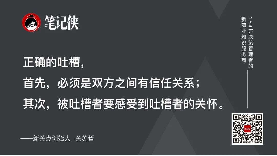正确的吐槽,首先,必须是双方之间有信任关系;其次,被吐槽者要感受到吐槽者的关怀。