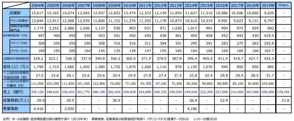 上图为2004年至2019年弹珠机游戏厅店铺数及弹珠机设置台数、游玩人数、销售额等推移数据。