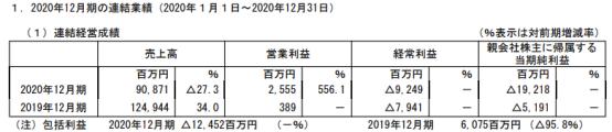 2020年12月期(2020.1.1-2020.12.31)环球娱乐销售额908亿7100万日元,同比减少27.3%;营业利润25亿5500万日元,同比增长556.1%;经常亏损92亿4900万日元,归属股东当期纯损失192亿1800万日元。