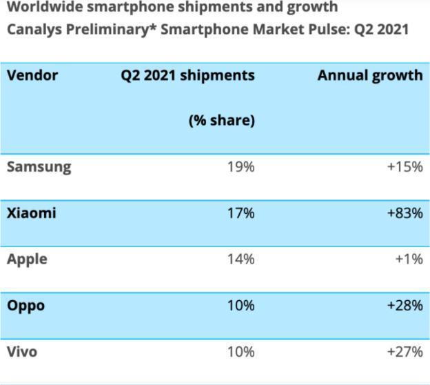 数据机构Canalys近期发布的数据显示,全球手机出货量排名前五名中:三星、小米、苹果、OPPO、vivo市场占比分别为19%、17%、14%、10%、10%,尤其值得关注的是增长幅度,三星相比上一季度增长15%、小米增长83%、苹果增长1%、OPPO和vivo分别增长28%和27%。
