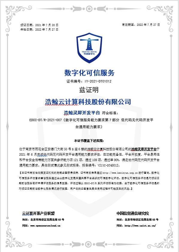 浩鲸科技也成为国内首批通过信通院“低代码无代码开发平台通用能力评测”的四家企业之一,再次体现了浩鲸科技在数字化转型和云原生领域的技术能力。