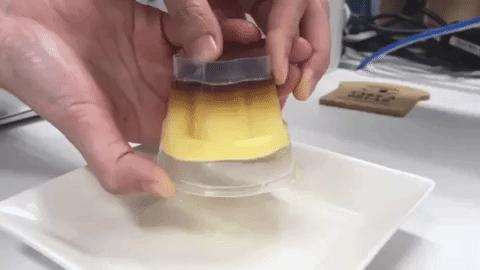 比如格力高的布丁,在包装底部设置了一 个凸起的部分 。只要按下去让空气进入杯内,布丁就会自动掉下来了。这样倒在盘子里吃布丁,既方便卫生,还能充满仪式感。