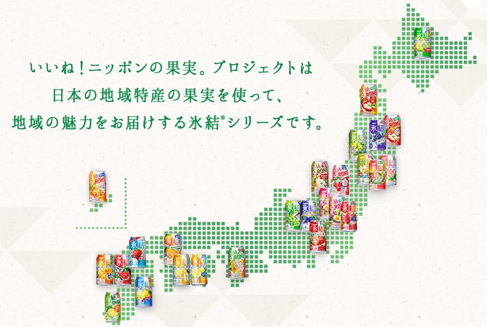 麒麟冰结的地域限定系列,命名为“日本的果实”。每个包装上都注明了使用了哪里产地的水果,如熊本产的橘子、北海道产的蜜瓜等等。