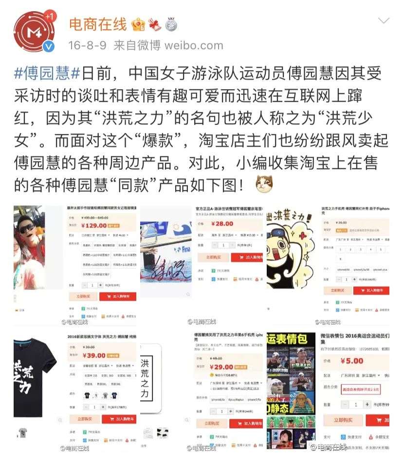 历年的奥运会也有不少同款带货的故事。傅园慧在里约奥运会凭“洪荒之力”出圈,最会做生意的某宝店主们当即默契地用她的表情制作了Q版T恤和手机壳,连她做直播时吃的同款蛋糕,店家们也能立马打上tag,定价1元一个。