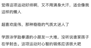 以及网友们纷纷表示射击这种运动好适合自己这种懒人,仿佛学成之后就能合理把“懒”转化成射击运动员身上那种宠辱不惊的气质。