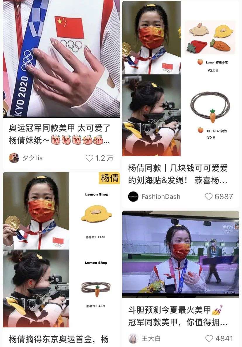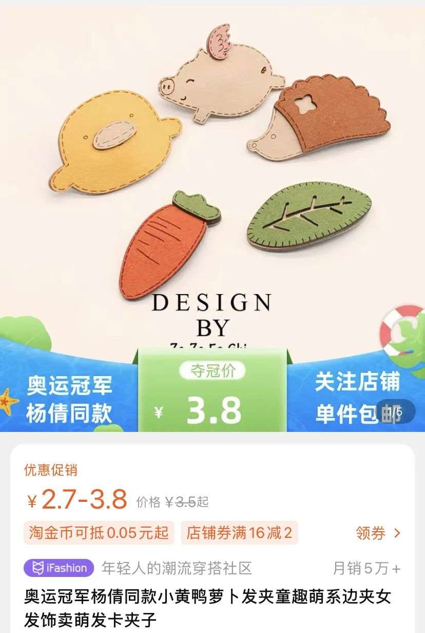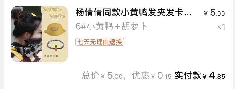 杨倩和她的配饰迅速占据了热搜,小黄鸭发夹在某宝的销售量直接暴涨42倍。只要3.8元就可以收获妹妹同款可爱,还能沾一沾奥运冠军的喜气,原本平平无奇的小配饰,成了席卷互联网的大风。