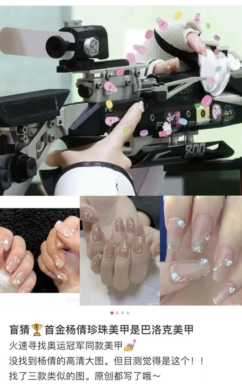 杨倩夺冠当天,网上就有人揭秘了她做的是巴洛克美甲,见多识广的网友们还纷纷下场仔细比对哪个才是最接近原版的纯正同款。