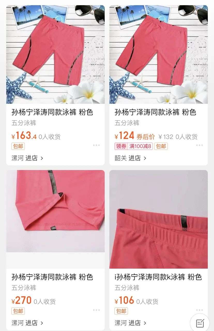 孙杨和宁泽涛同款的粉色泳裤,某宝售价从45-200元不等,当时被吸引购买的网友也挺多。这也不意外,哪个猛男能抗拒得了粉红色?