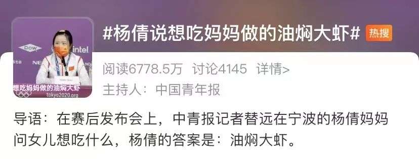 就连运动员爱吃的食物,也能迅速“点燃”网友:之前牛肉干和鸭舌要标上“孙杨爱吃”,搜“傅园慧同款”就能看到话梅和黄桃罐头,这两天杨倩在采访里说了一句想吃油焖大虾,大虾的销量立刻狂增670%。
