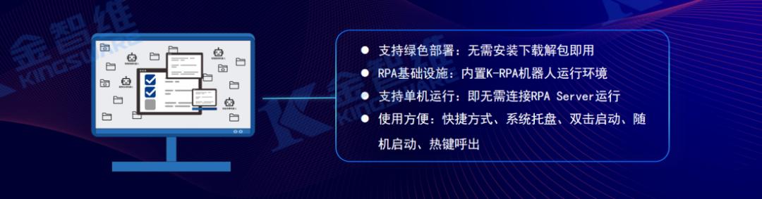 金智维K-RDA机器人桌面助手可适应业务独立、大企业内小组织自我管理、安全保密隔离严格或业务用户岗位化工具化的RPA运营管理场景。